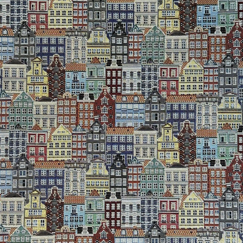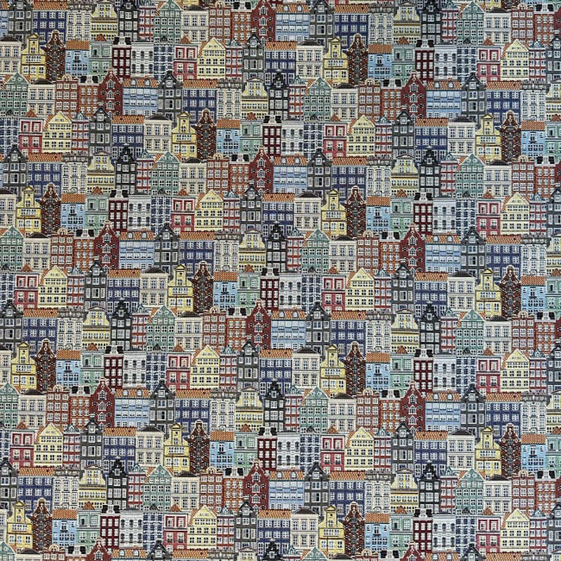 Breng de sfeer van Amsterdam naar je huis met onze gobelin stof met grachtenpandjes. Deze geweven gobelin stof heeft een prachtig dessin met Amsterdamse grachtenhuizen. Ideaal voor kussens, gordijnen, meubels en andere creatieve projecten in je interieur.