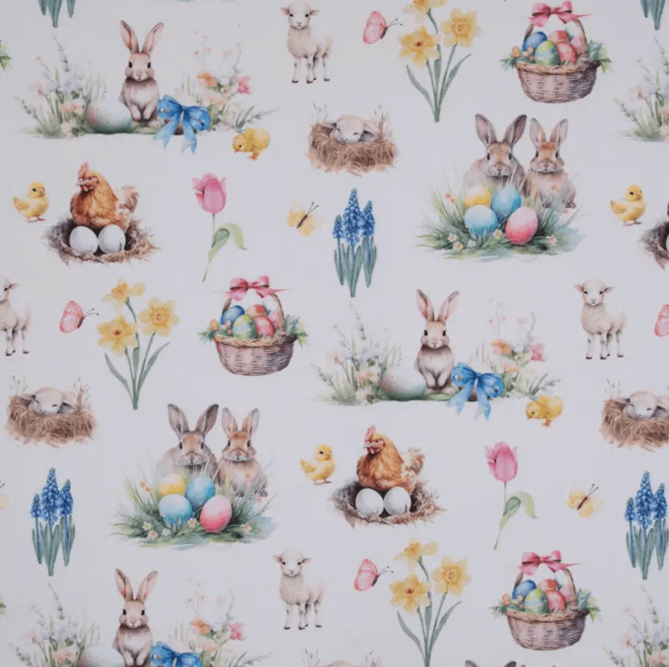Deze katoenen Pasen stof met konijnen, paaseieren, kippen, kuikentjes, eendjes en bloemen geeft je projecten direct een vrolijk, lente fris tintje. Het zachte katoen voelt prettig aan en is ideaal voor tafelkleden, kussens, kleding of accessoires.