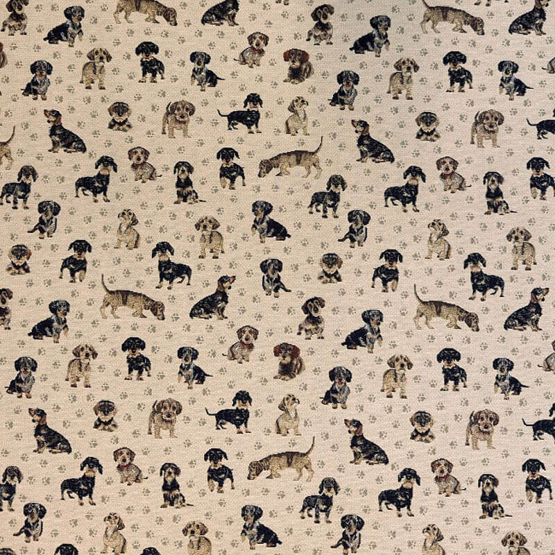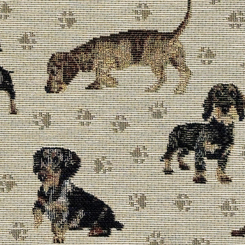 Met een leuk patroon van teckels op een lichtbeige achtergrond is deze gobelin stof perfect voor wie iets extra's aan het interieur wil toevoegen. Ideaal voor sierkussens, gordijnen, wandpanelen of het stofferen van meubels.